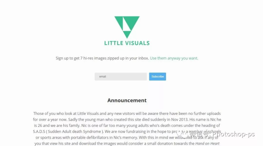 Little Visuals 每周会更新七张高分辨率的图片。主题范围从工业零件至田园风景等等。你可以将它用于任何地方,包含商业、个人项目。