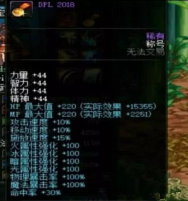 DPL 2018的去年PK决斗大赛的奖励,不过该称号是有时间限制的,目前已经绝版了,以称号的属性能排名第一也是实至名归,10%的攻速,火光冰暗四属强+100,双暴击+100%,命中+30%,这样的属性就就算是当前最强称号也无法比拟。