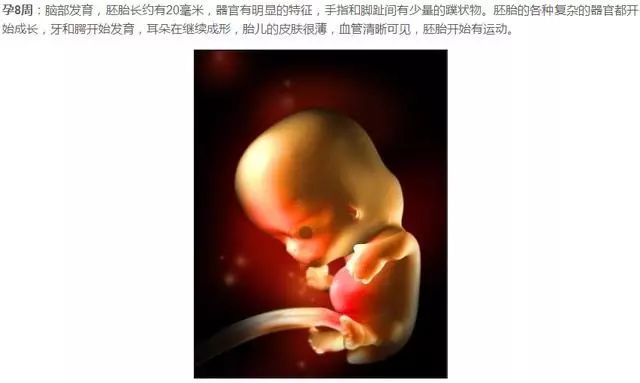 孕9周:五官发育胚胎已经成形,约长25毫米,此时才可以称为真正意义上的“胎儿”。孕妇此时子宫膨胀得很大,胎儿所有的器官、肌肉、神经都开始工作,并且发育迅速。
