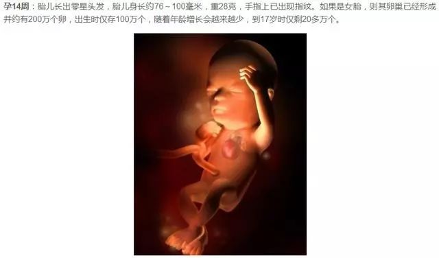 孕20周:胎儿生殖器发育基本完成(男) 进入孕中期,宫底每周大约升高1厘米。胎儿的身长在14~16.5厘米之间,体重大约250克。胎儿开始吞咽羊水,肾脏已能够制造尿液,头发迅速生长。