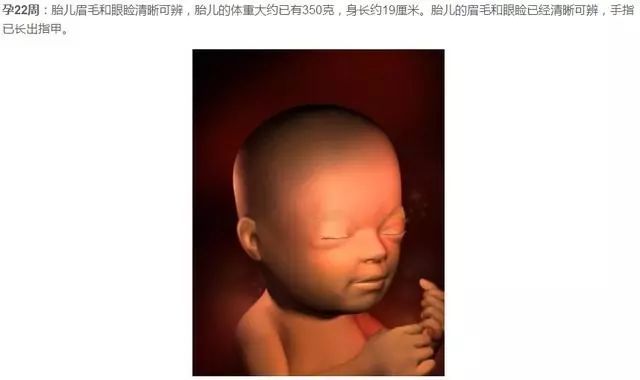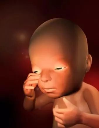 孕16周:胎儿打哈欠,胎儿此时看上去象一个梨子,身长约12~15cm,体重约120~150克,头部明显直立,双眼已经移到了头部前方,仍然紧闭,但是眼球可以移动;眉毛、睫毛正在生长,耳朵也达到了最终的位置,此时心率约150次/分。