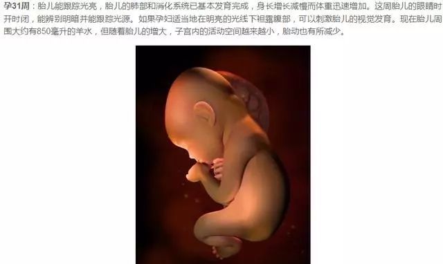 孕33周:胎儿皮肤变成粉红色 胎儿体重大约有2000克,身长约48厘米。孕妇子宫里的空间几乎被胎儿占满,胎儿的活动余地很小。胎儿皮下脂肪大大增加,皱纹减少,身体变得圆润。