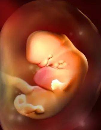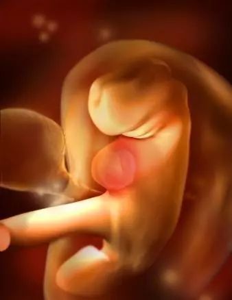 孕7周:面部器官可分辨,胚胎长约12毫米,大头与身体不成比例。面部器官可分辨,眼睛未长成但非常明显,鼻孔大开,耳朵略凹陷。手、脚及四肢幼芽初成,肌肉纤维和垂体已经发育。此时听不到胎心音,但胚胎的心脏已经划分成左心房和右心室,每分钟大约跳150下。