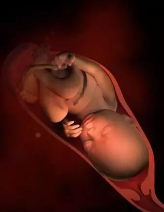 孕34周:大部分胎宝宝头向下,胎儿体重大约2300克,坐高约为30厘米。此时胎儿已将身体转为头朝下的姿势,头部已经进入骨盆。