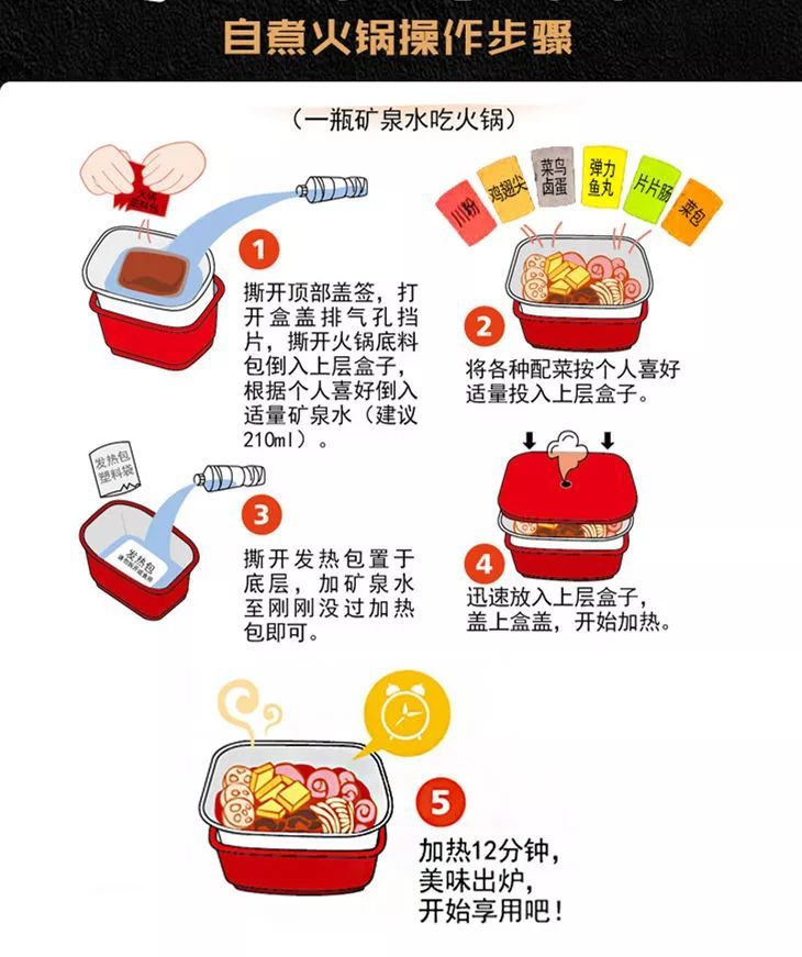 从外观上看,这类方便火锅区别于传统火锅,比盒装的方便面要大一点,盒内食材丰富,食用方法简单,只需将食材放入上层盒子,将加热包外袋撕掉放入底层,倒入凉水,12-15分钟后加热完毕就可食用。
