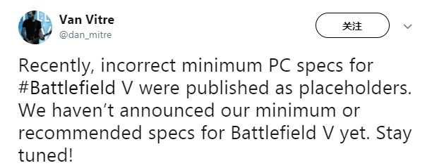 然后,官方和Origin均否定了这一说法。虽然DICE优化水准有目共睹,但每次新《战地》依然会让“老硬件”有些力不从心。Origin商店在5月30日撤下了战地5PC版系统配置要求的文字,转而以“敬请期待”示人。EA全球社区经理Dan mitre今天在推特上澄清《战地5》PC配置的信息有误,其实它是占位符。