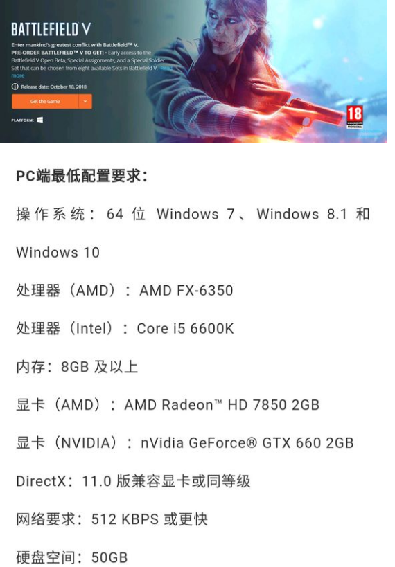 战地系列使用寒霜引擎后,每一代《战地》正统续作的推出都意味着画面上的极大的进步。然而不久前公布的《战地5》消息,Origin客户端显示的战地5最低配置需求竟然与《战地1》完全一致,只需要GTX 660 2GB的显卡就能运行游戏。因此很多人也有了疑惑,DICE对战地5的优化竟能做到如此地步?