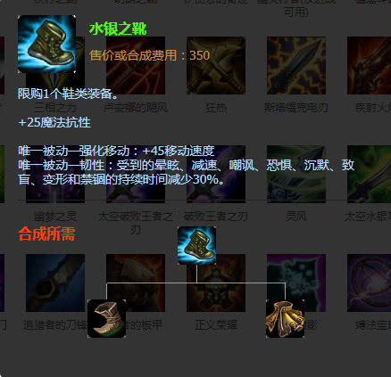 水银鞋+25莫法抗性+45移动速度,唯一被动受到的控制技能持续时间减少30%,对于装备成型的亚索进团杀敌非常适合出这件装备。