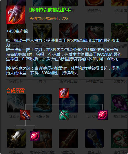 斯特拉克的挑战护手+450生命值,+50%基础攻击力的额外攻击力,再5秒内受到高于400-1800时触发被动,使得英雄体型和力量增长,获得+30%韧性持续8秒。