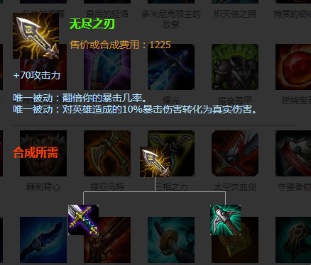 无尽之刃+80攻击+25%暴击几率暴击伤害×225%,配合亚索的被动加电刃的25%暴击几率就是100%的暴击几率,非常适合亚索出装的第二件装备