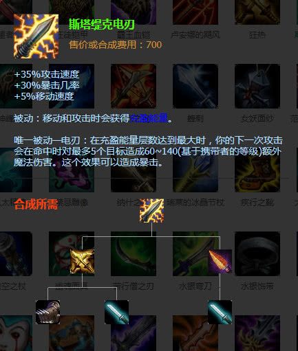 斯塔缇克电刃+35%攻速+25&暴击几率,唯一被动在充盈能量层数100时,下次攻击会最多对5个目标造成60~140的额外魔法伤害。非常适合亚索出装的第一件