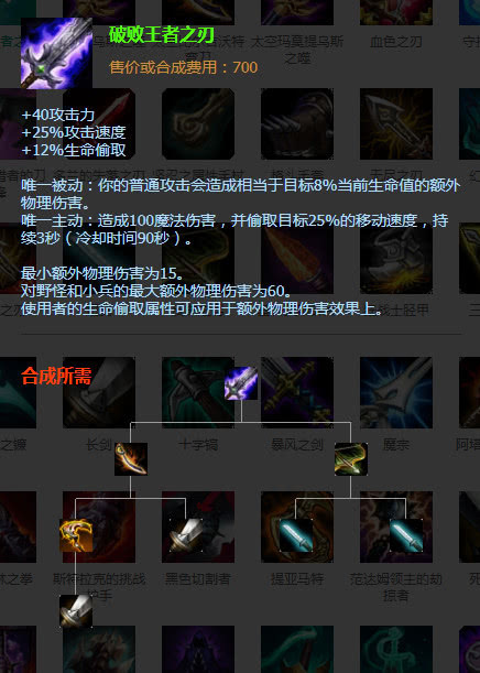破百王者之刃+40攻击力+25%攻速+12&生命偷取,唯一被动普通攻击会对敌人造成当前生命值的8%,唯一主动造成敌人100的魔法伤害并偷取敌人25%的移动速度,非常适合亚索Q技能的高爆发高伤害。