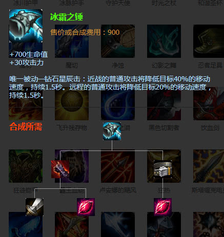冰霜之锤+700生命值+30攻击力,唯一被动近战普通攻击给敌人造成40%减速,远程则是20%,非常适合亚索在追击敌人时使用。