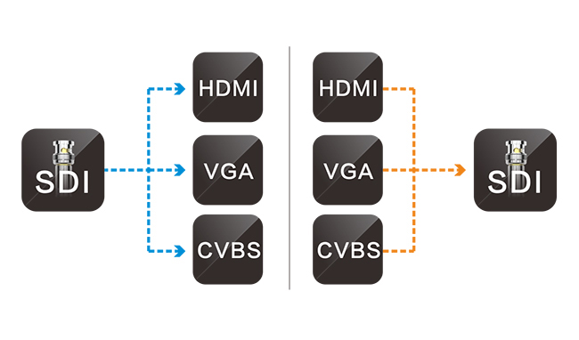 电视台节目制作以SDI信号为主,多数情况需要将视频格式进行转换,如当使用非SDI监视器时,需将SDI信号转换成HDMI或其他信号进行监看,如当对IP流节目源进行制作时,需将IP流视频解码成SDI信号进行下一步制作。