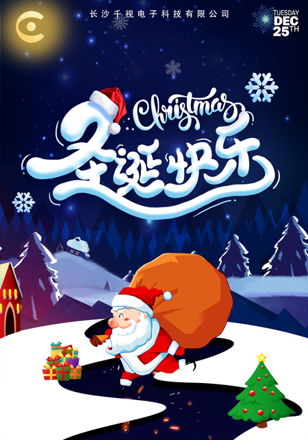白雪飘,钟声敲,圣诞节又来到;鹿铃响,喜气洋,惬意幸福心情爽;圣歌唱,心花放,吉祥快乐从天降。千视电子祝您圣诞快乐!