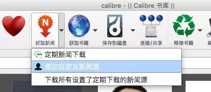 打开 Calibre,在 Calibre 主界面上方的功能图标中找到“抓取新闻”,点击右侧的向下箭头,在弹出的菜单中点“添加自定义新闻源”。