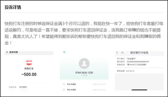 并且刘师傅还表示,不仅保证金的退还申请没有回应,连刘师傅跑订单赚的钱也没办法提现,“快狗打车平台实在是欺人太甚”。