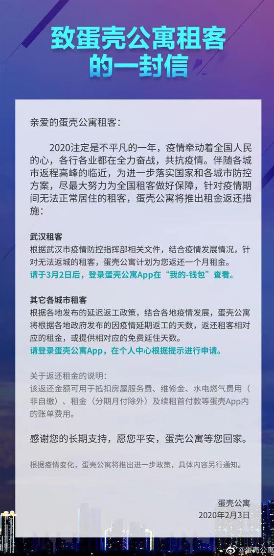 这是目前国内分散式长租公寓企业中首家正式公开发声,为疫情期租客提供租金补贴的企业。