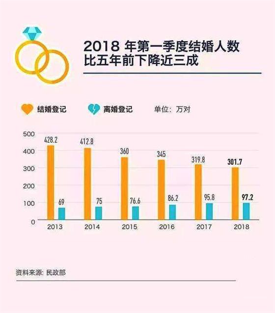 根据最新消息显示,2019年中国婚姻登记机关共办理结婚登记947.1万对,结婚率从2014年起持续下降。2019年办理离婚登记415.4万对,补发结婚证和离婚证书403.4万对。我们国家的离婚率逐步上升,结婚率迅速下降。从这些数据中,我们可以感受到现在的年轻人对待结婚的态度,已经不同往日。