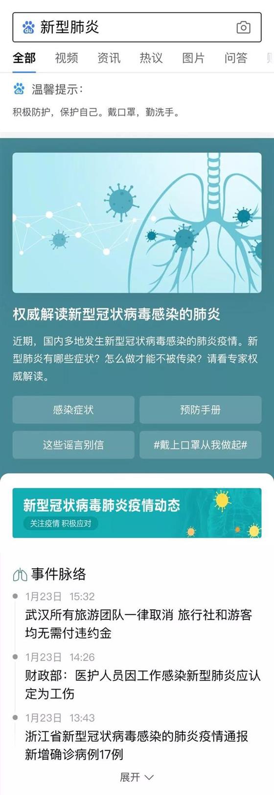 对于这种新型病毒防治,我们所知甚少。为此,百度 APP 首页上线“抗击肺炎”频道,实时更新全网权威新闻报道。