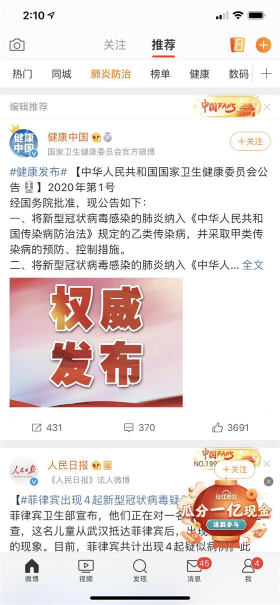今日,微博官方宣布正式在热门微博中上线“肺炎防治”专栏,将持续为公众提供权威媒体、政务、医疗专家等各方专业的声音,让公众了解防控知识。目前,健康中国、人民日报、我在120上班(北京急救中心官博)等,均在“肺炎防治”专栏上线。