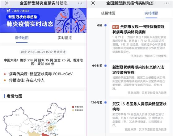 丁香园·丁香医生则推出了“全国新型肺炎疫情实时动态”网页,通过疫情地图与实时播报,带来新型冠状病毒感染的肺炎的第一手资讯。在实时播报页面,丁香医生会整点更新汇总各地最新通报进展,以及各地应对肺炎采取的重要措施、手段;而“疫情地图”页面则会实时呈现中国大陆各地确诊病例、疑似病例、治愈病例的汇总情况与地域分布。
