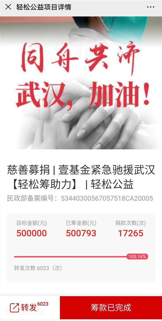 为此,轻松筹发挥优势,利用旗下轻松公益平台,连续开通了多个募集窗口,对武汉同胞进行在线募援。截至目前,驰援武汉的两个项目一经推出,即获得了来自全国用户的参与支持,短短几个小时,150余万资金筹备业已完成,轻松筹与爱心网友们再次刷新“中国公益速度”,为大武汉献上自己的心意。