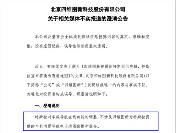 2020年1月17日下午,特斯拉中国官微发文《小年,大惊喜》,宣布特斯拉地图数据服务商将更换为百度地图。因此,一直与特斯拉合作的四维图新被传“新被踢出特斯拉供应链”。