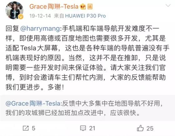 然而,更换为腾讯地图以后,特斯拉的导航服务仍被广大用户所诟病。2019年12月14日,特斯拉全球副总裁曾公开表示,对中国区车主所集中反映的地图导航不好用问题在加班加点进行改进。只是没有想到,最后是采用了更换地图服务商这种模式。