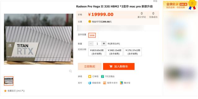 AMD 推出的 Radeon Vega II Duo 双 Vega 20 核心显卡目前是 Mac Pro 独占的,所以网上也比较难找,我在淘宝找到一家店,单价19999元,我购买两张总计39998元。