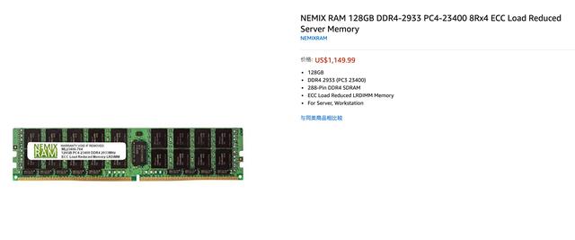 我在美亚找到了 NEMIX 这个牌子的内存,规格同样是2933MHz DDR4 EEC,售价1499.99美元/条。购买12条的售价是17999.88美元,约合人民币125475元。