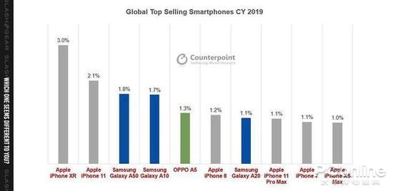 [PConline 资讯]苹果每年与其他各品牌不同的是,其每年发布的新款机型并不多,但论单款机型的销量却一直保持非常凶猛。根据市场公司Counterpoint近日发布了2019年全球智能手机销量数据中显示,苹果、三星和OPPO进入前10。