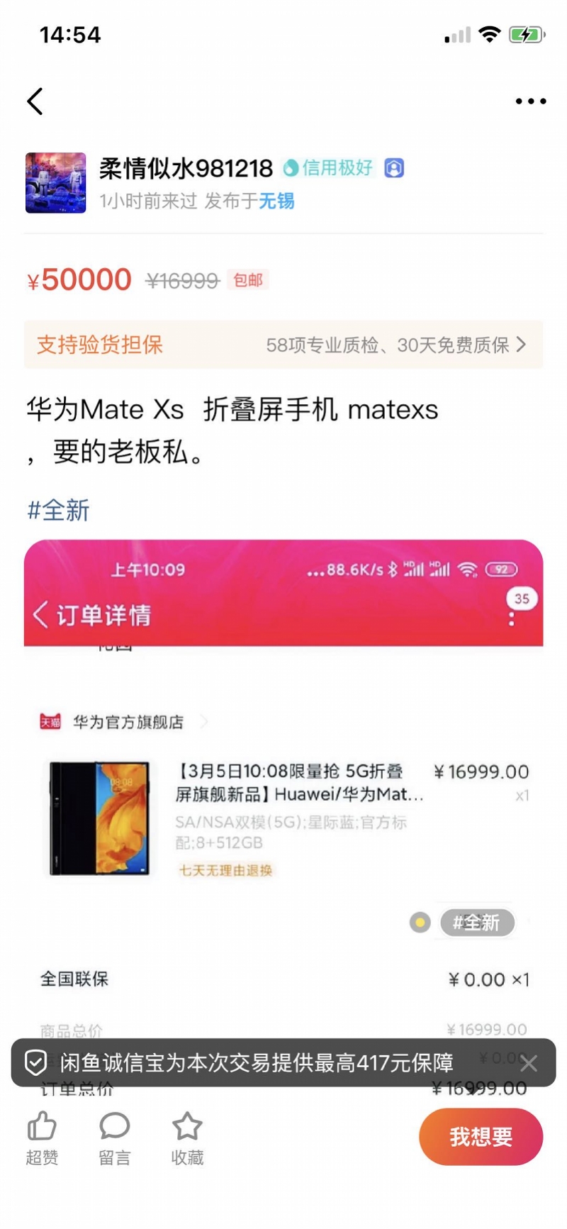 而在闲鱼平台上,Mate Xs的售价也是至少32999元起,有不少拍到Mate Xs的“幸运儿”标价4万出售,一位江苏网友甚至将刚拍到的Mate Xs以50000元价格转手。有网友告诉南都记者,有现货,“我定的,直接可以发,今天保证能发顺丰。”也有网友表示可以25000元回收Mate Xs。