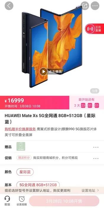 华为Mate Xs于2月26日10:08开启预约,截至3月4日晚,MateXs在华为商城、京东、天猫三大平台的总预约量超过一百万台,其中华为商城的预约量超64万部,京东和天猫的预约量分别超30万和18万部。