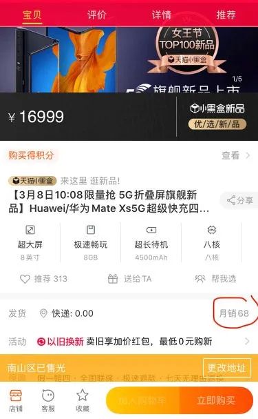 华为没有公布首销总共卖了多少部MateXs,但三大销售平台之一的天猫销售页面显示,该平台该机的销量仅为68部。
