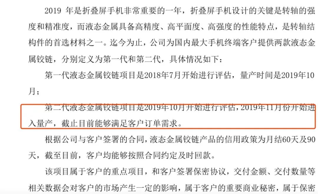 铰链的供应商目前已基本锁定宜安科技,该公司近日在回复深交所的关注函时表示,公司为国内最大手机终端客户提供两款液态金属铰链,分别定义为第一代和第二代,且“液态金属铰链2019年11月进入量产,目前能够满足客户订单需求。”