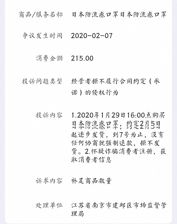 另一种情况和小仙一样,自以为幸运的抢到了,但最后只得被强制退款。多位消费者向界面新闻记者反映,他们曾都在淘宝、京东、苏宁易购等电商平台上成功抢到口罩,但过了发货时间之后商家迟迟不发货,反而收到来自平台的退单提醒,理由多为“存货不足,需要等待”。