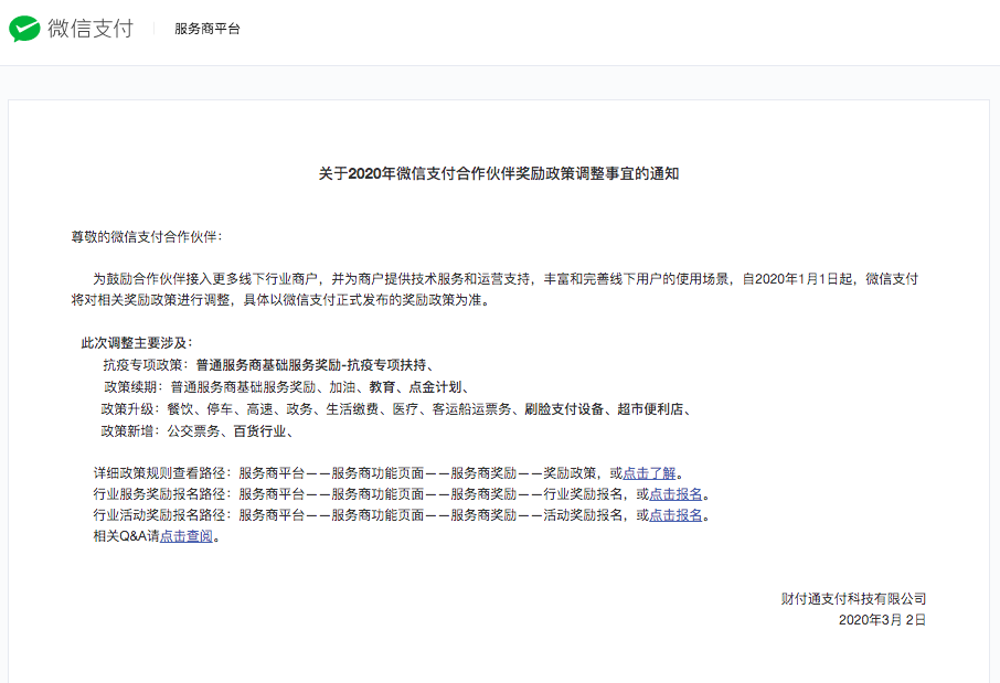 3月2日消息,微信支付服务商平台发布最新《关于2020年微信支付合作伙伴奖励政策调整事宜的通知》,此次调整主要涉及4大部分。