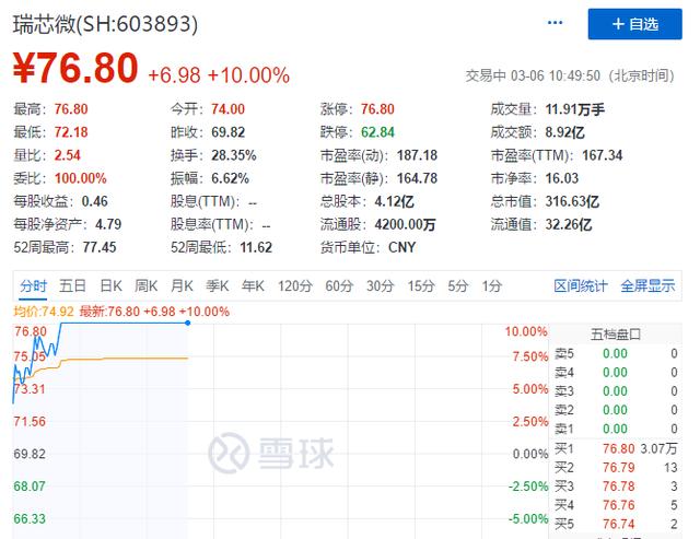 经过17天连续涨停,瑞芯微已由原市值不到40亿,一度达到290.7亿的市值,估价由发行价9.68元一路飙升,累计上涨达628.4%,截止3月3日收盘,已达70.51元,3月4日,股价还一度冲高到73.7元。
