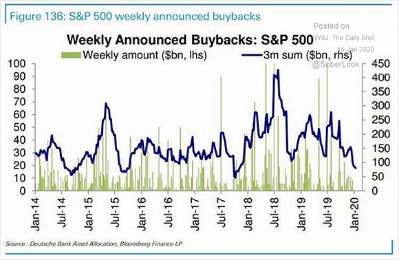 数据显示,标普500指数的股票回购水平,从2018年7月(平均每周)的1000亿美金,已经下降到了2020年1月的100亿美金。同时期标普指数上涨了14%。