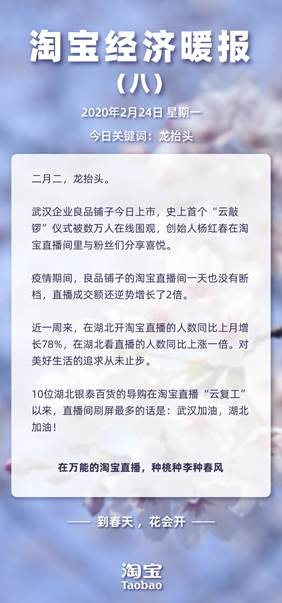2月18日,10位远在湖北的银泰百货的导购员,在淘宝直播“云复工”。开播之后,满屏都是“武汉加油,湖北加油”。首场直播的观看人数,相当于1家顶级购物中心的周末客流,期间多款商品售空。