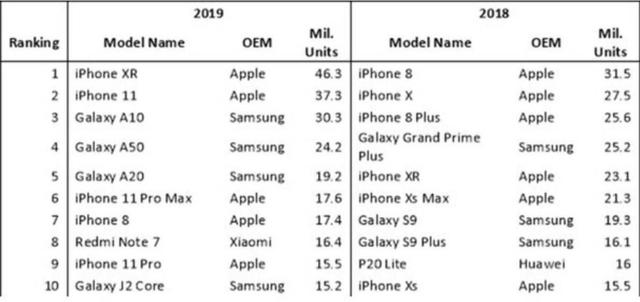 在科技高速发展的今天,手机行业已遥遥领先,早已将其他电子行业远远甩在身后,成为人们生活中不可或缺的一部分。为追逐时代的潮流,iPhone、三星、小米、华为、OPPO等数十个知名品牌在每年争先恐后的推出新机,以达到迅速抢占市场,扩大市场份额,增加销售量的目的。那么,在手机行业竞争日趋激烈的今天,2019年全球智能手机单品销量是如何排名的呢?