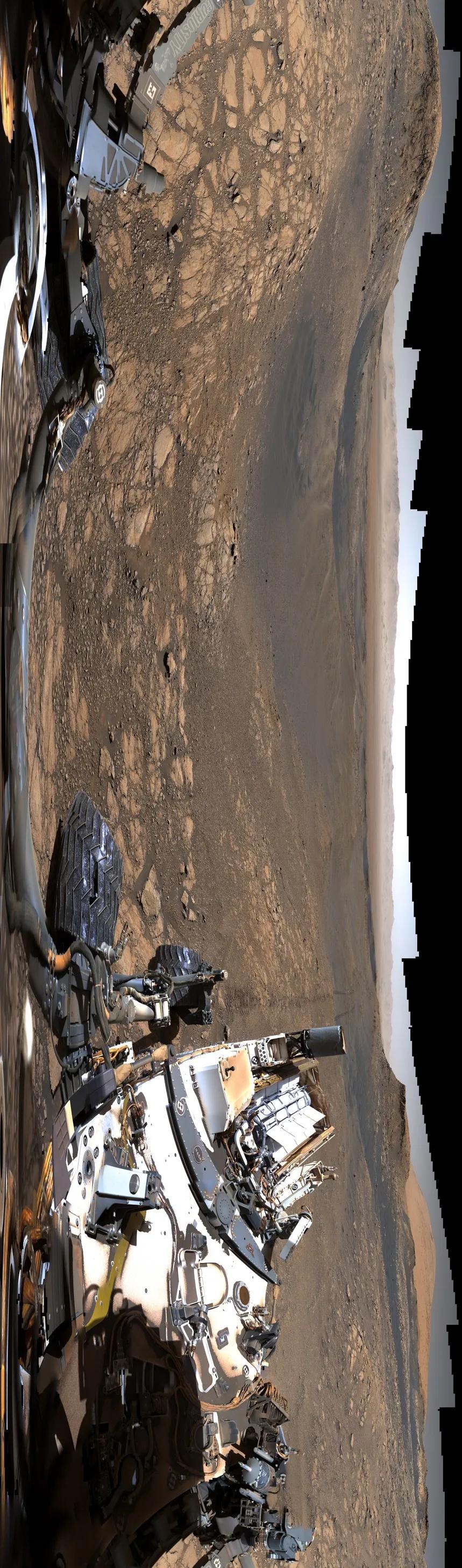这张全景照是好奇号用其桅杆相机的远摄镜头拍摄的。除此之外,好奇号还使用它的中焦镜头拍摄了一张总像素值约为6.5亿的全景照片,将火星车的大部分包括在了内。