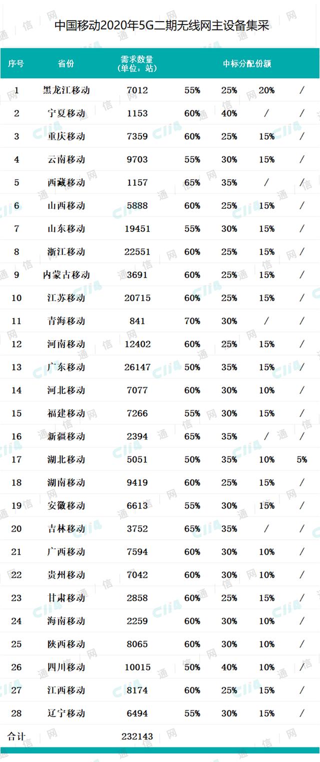 C114讯 3月6日消息(九九)中国移动今日发布2020年5G二期无线网主设备集中采购公告,共涉及28个省、自治区、直辖市。据C114统计,总需求为232143站。公告显示,本项目采用份额招标,中标人数量2-4家不等。