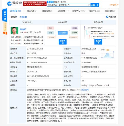 北京春雨天下软件有限公司成立于2011年7月,注册资本约2749万人民币,法定代表人为公司联合创始人曾柏毅,公司经营范围包括健康咨询;健康管理;销售医疗器械I类等。