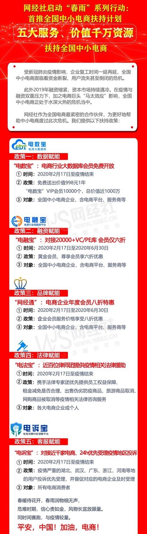 据记者了解到,此次“全国中小电商扶持计划”是网经社“春雨”行动的第一个公开计划,通过整合网经社门户、智库、平台三大服务的核心资源,从中小电商亟需的大数据、融资、品牌、法律、客服五大维度切入,为全国中小电商、用户赋能。