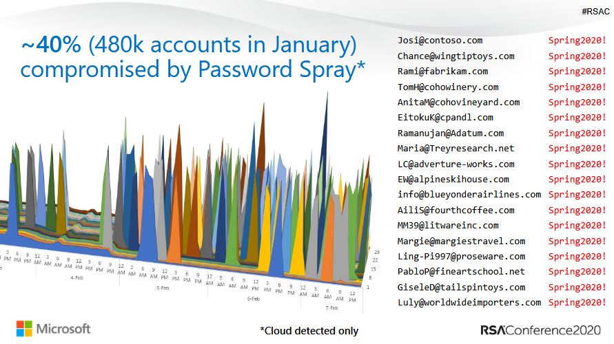 多数 Microsoft 帐户被黑客入侵的主要来源是密码喷洒(password spraying),攻击者通常会选择比较容易猜测的密码,挨个账户进行破解尝试,然后使用第二个密码依次尝试攻击,以此类推。