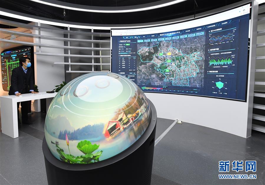 3月10日,在海淀(中关村科学城)城市大脑展示体验中心,工作人员展示海淀区生态环境领域分平台。新华社记者 任超 摄