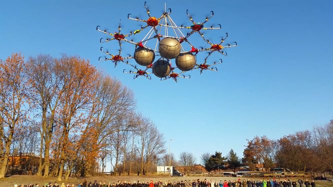 当地时间2016年1月12日报道(具体拍摄时间不详),据国外媒体称,挪威奥斯陆大学教师Krister Borge带领学生历时两年,耗费20多万挪威克朗(约合人民币14多万元),打造了一架具有48个马达、24块电池的大型无人机。据悉,该无人机为八爪直升机,功率接近70千瓦,能够承受一个人的重量,主要由铝条及胶合板制成。目前该无人机已经完成了首次试飞,正在等待有关部门批准,以进行与载人相关的试飞试验。