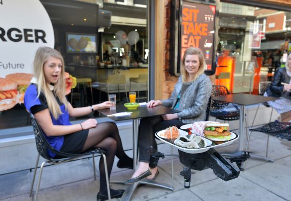 当地时间2013年6月10日报道,英国一家寿司连锁店推出名为iTray的飞行餐盘,大大提高了上菜的速度。现在,客人点餐之后,厨房员工把食物放在iTray上,服务员就可以用iPad来操纵上菜。iTray以时速25英里的速度在餐桌之间穿梭,将食物送到50米之外的客人面前,比服务员走路送餐的速度快6倍。当食物被取走之后,iTray就会自动返回。同时,厨房里的员工还能通过实时监控录像查看送餐的情况。不可用于封面,不可用于商业。